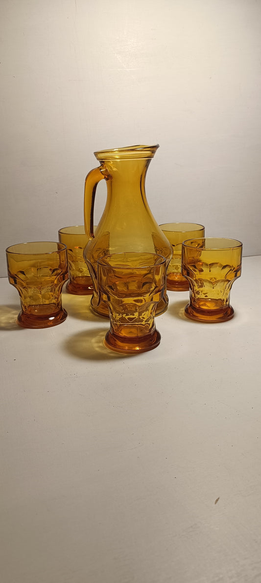 Pichet à jus en verre ambré plus cinq verres ambrés année 70.