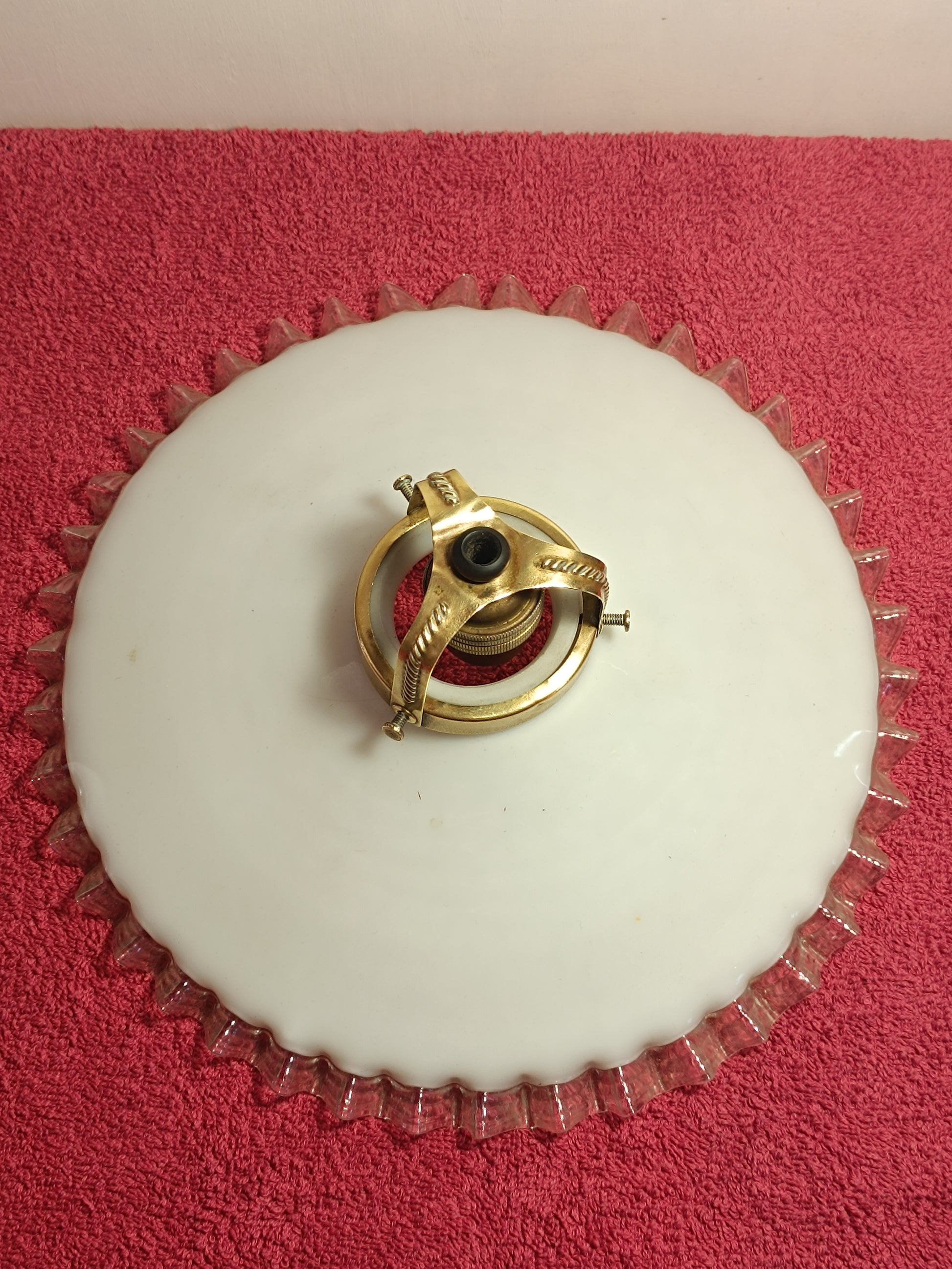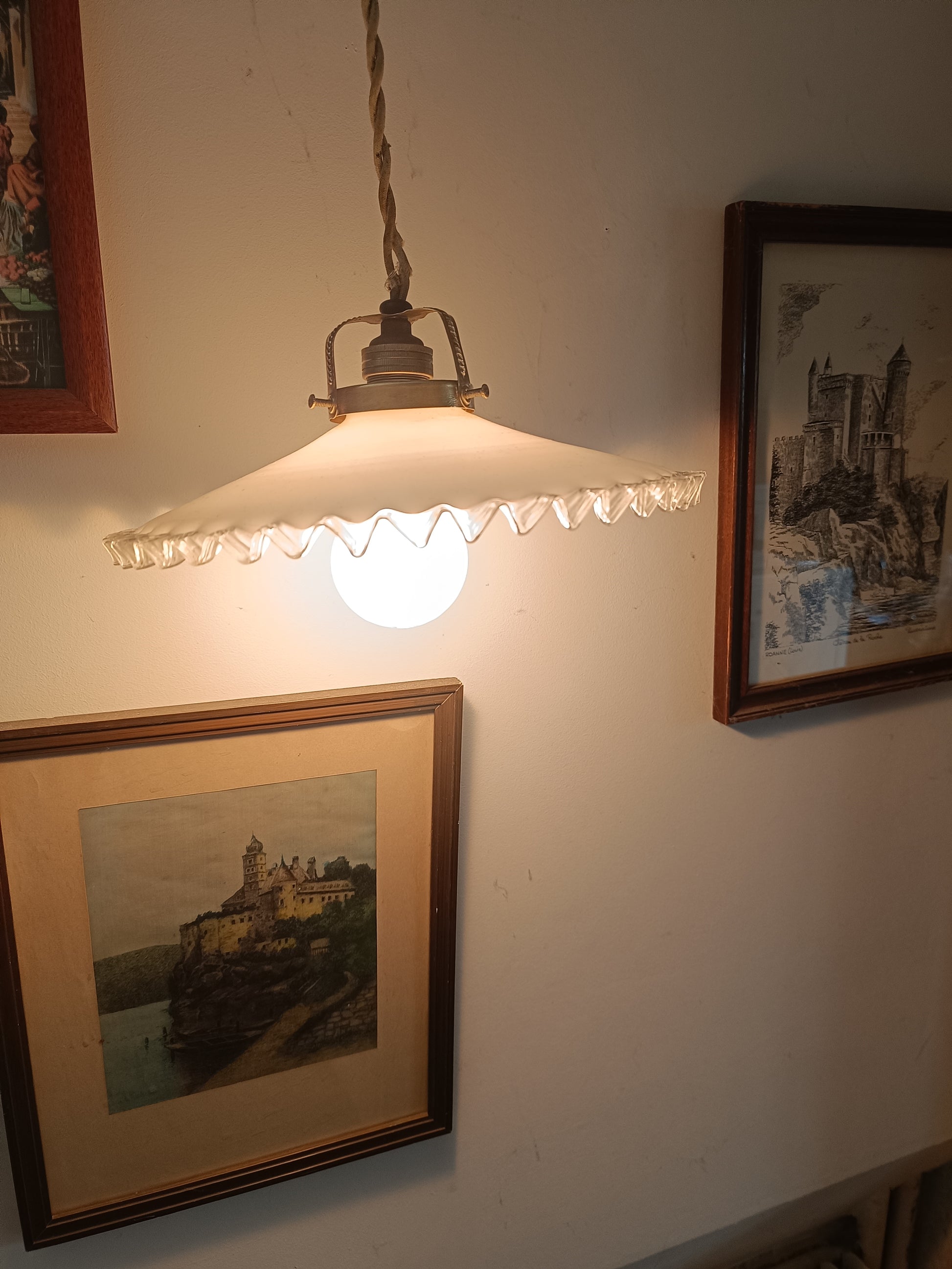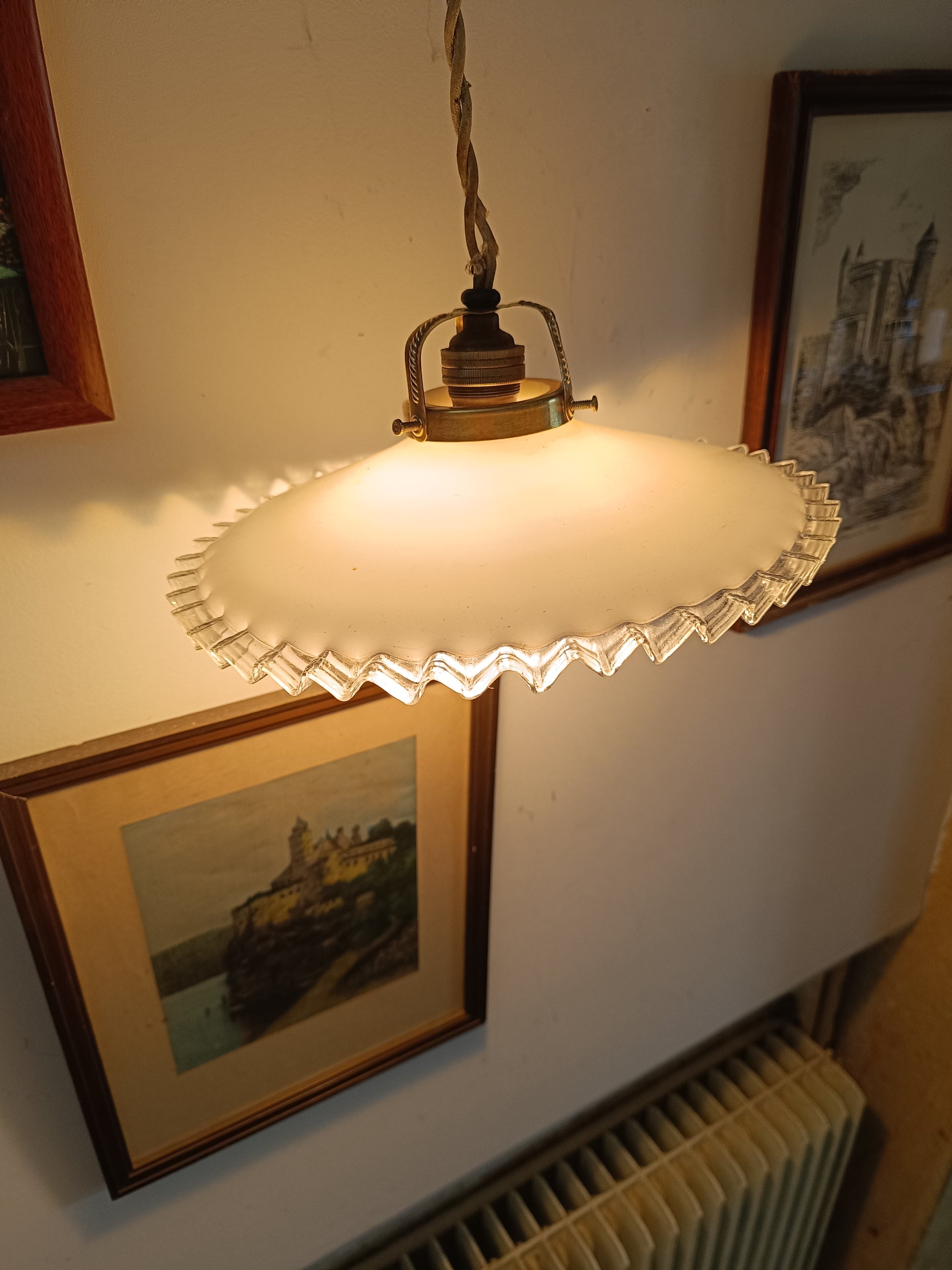 Abat-jour ancien en opaline blanche le pourtour jupé est en verre transparent. Pour suspension.