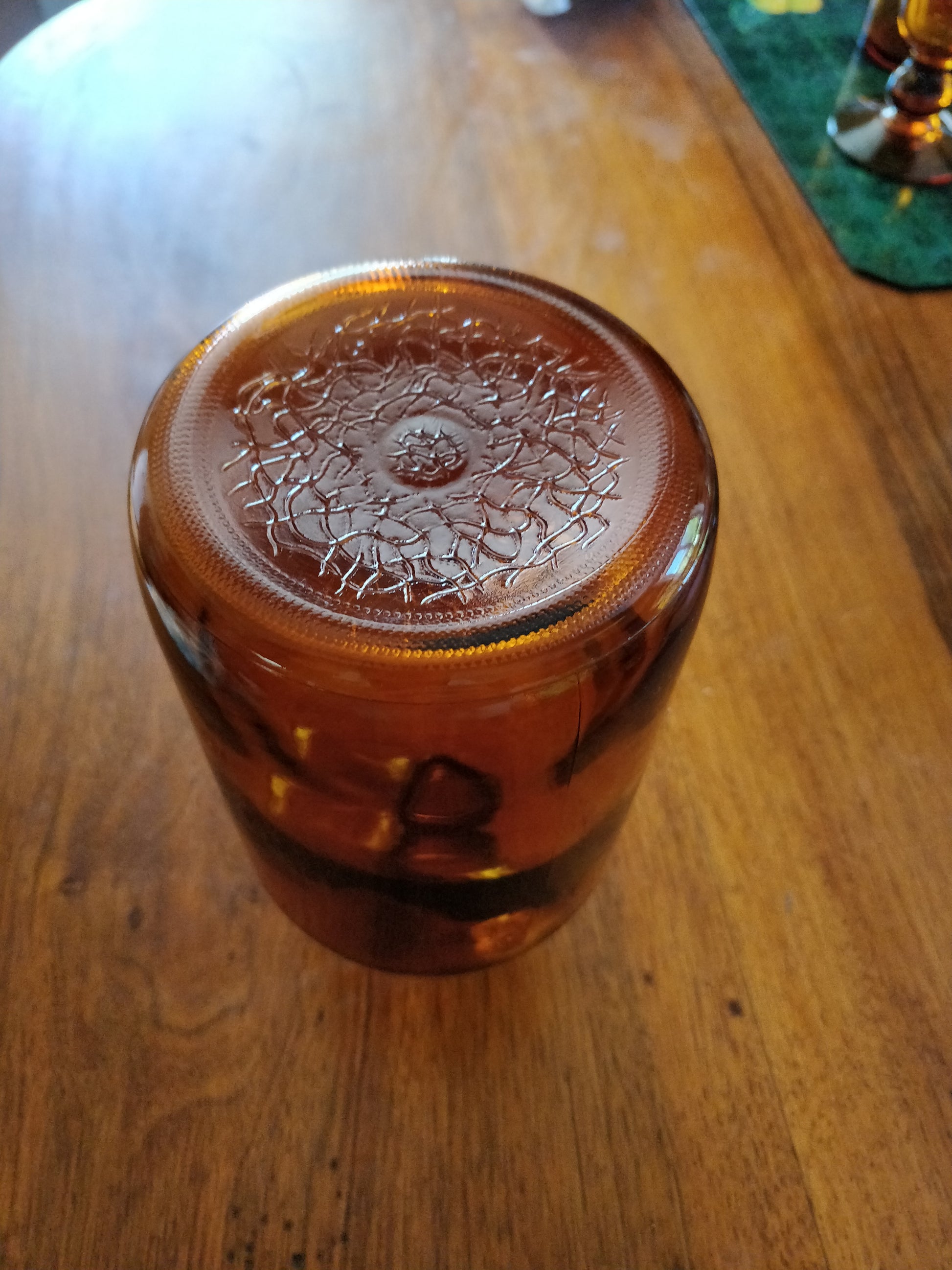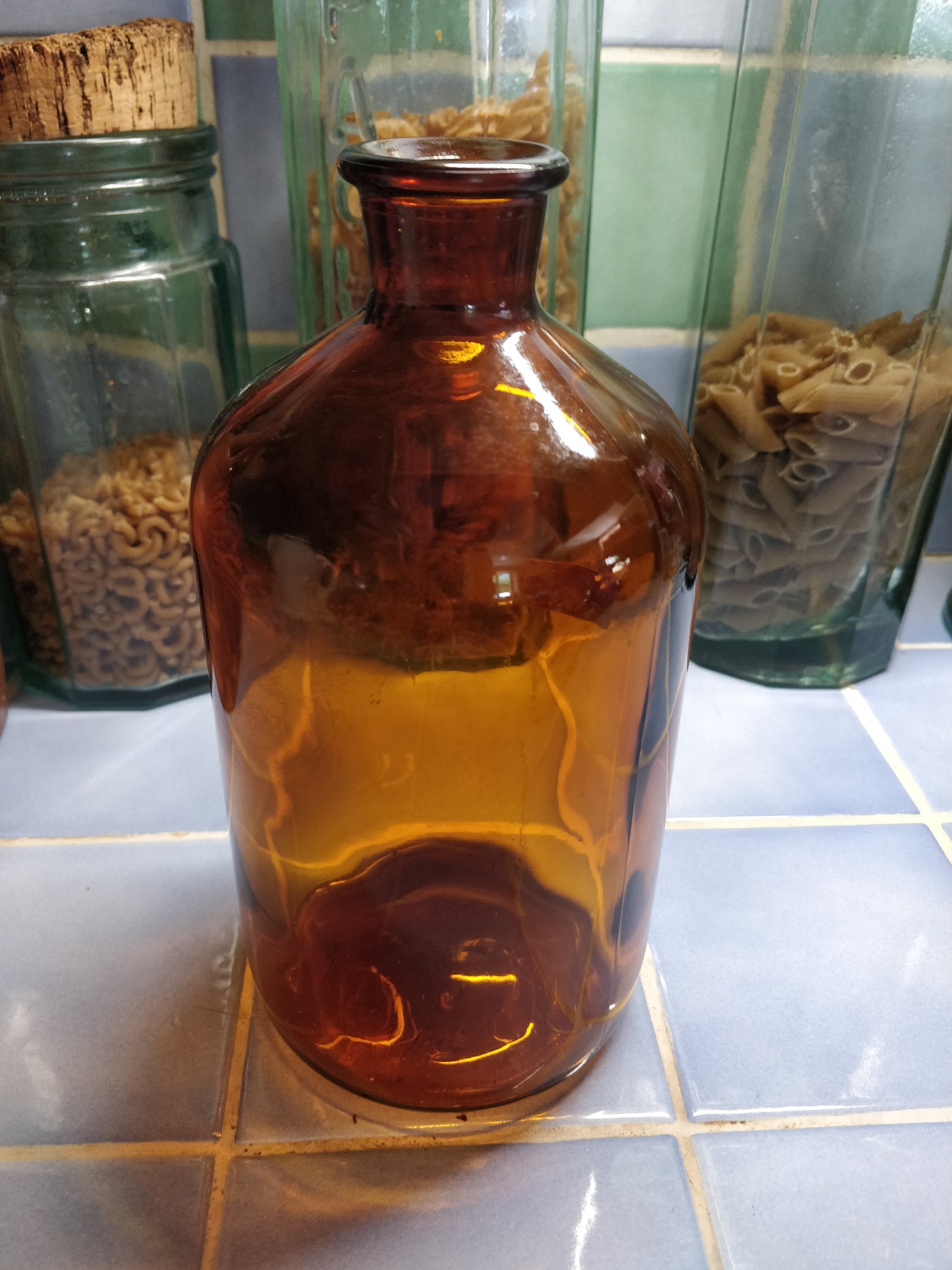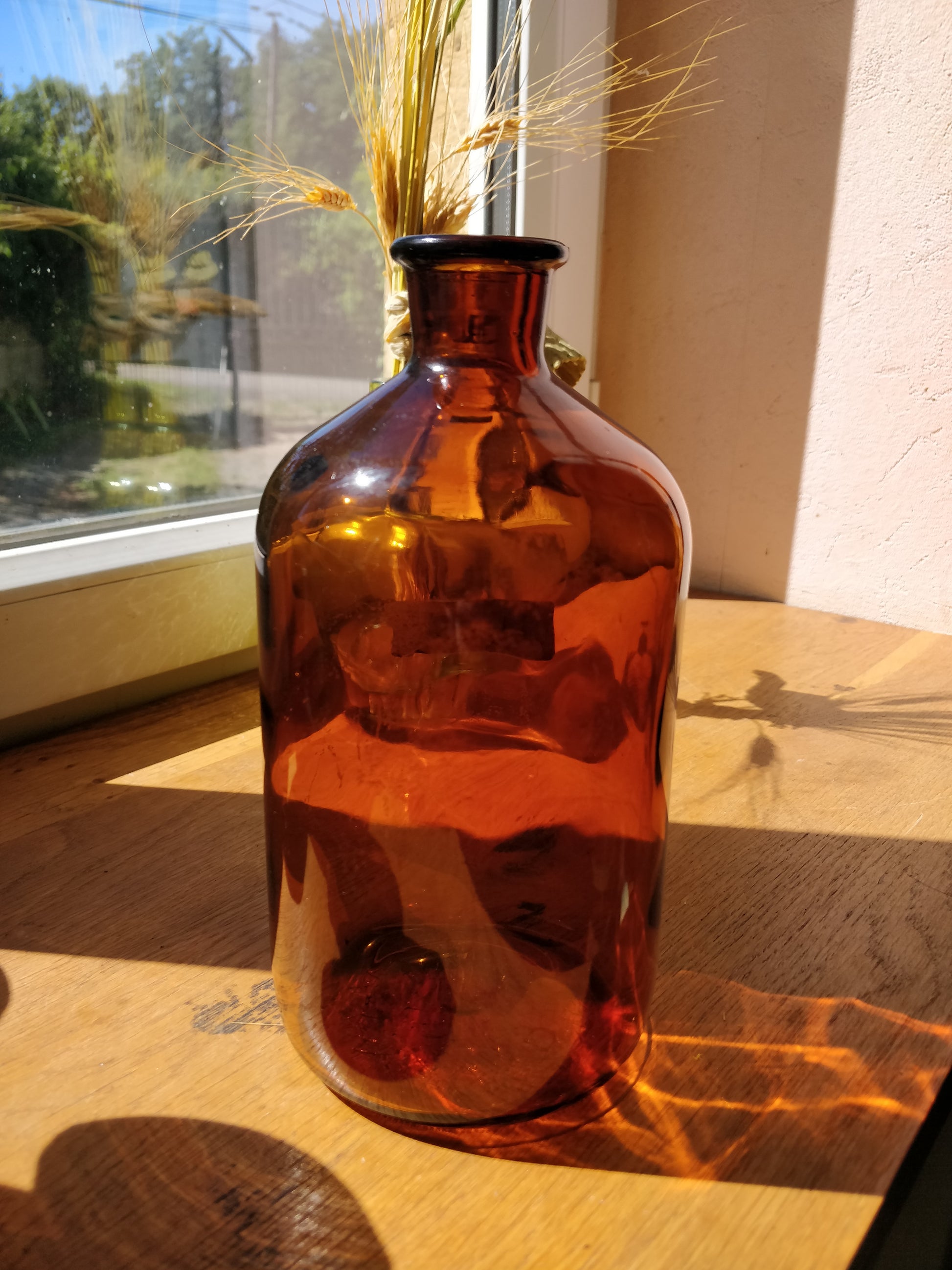Ancien flacon de pharmacie/apothicaire en verre ambré, en parfait état, sans manque ni fêle.