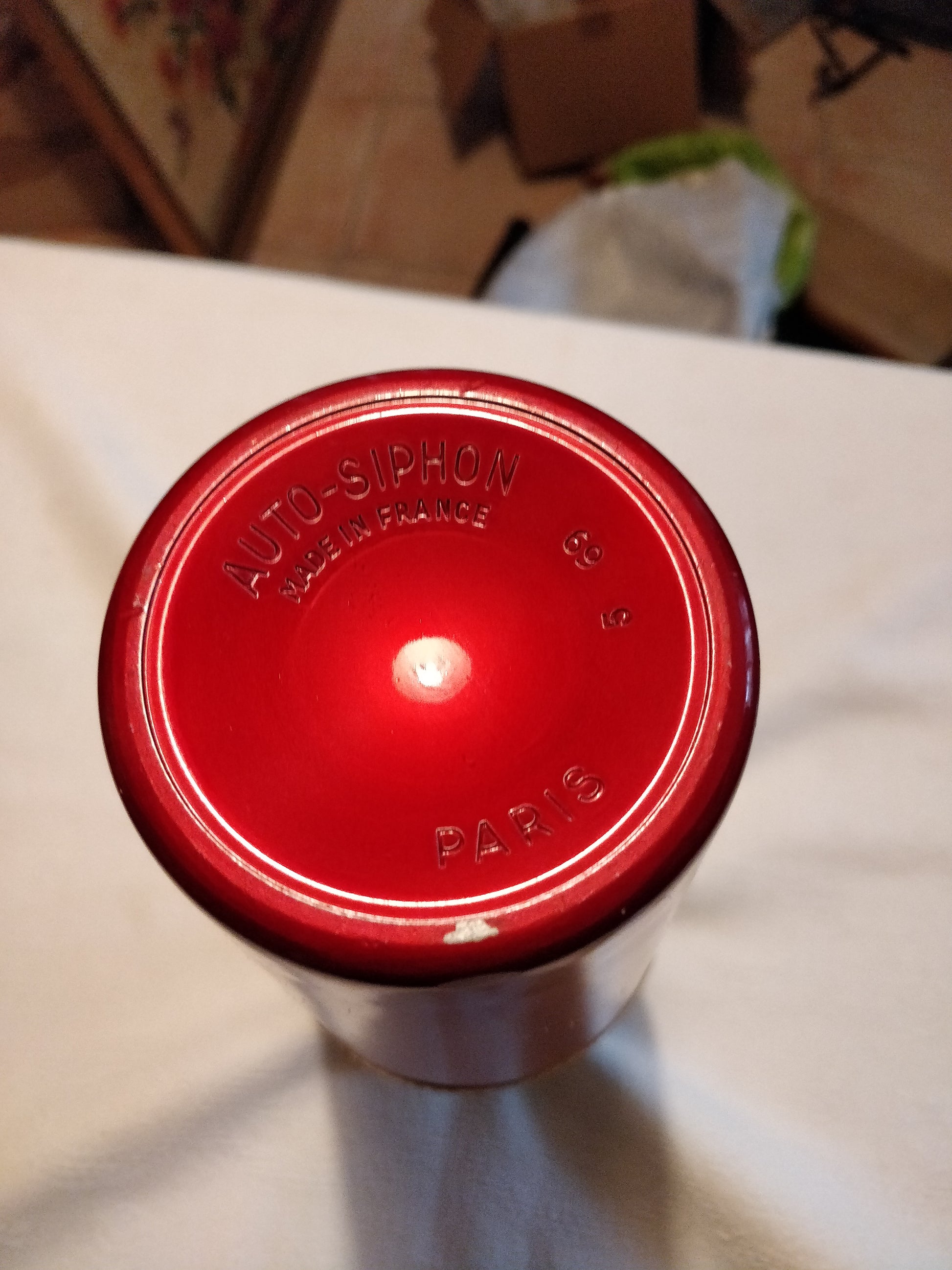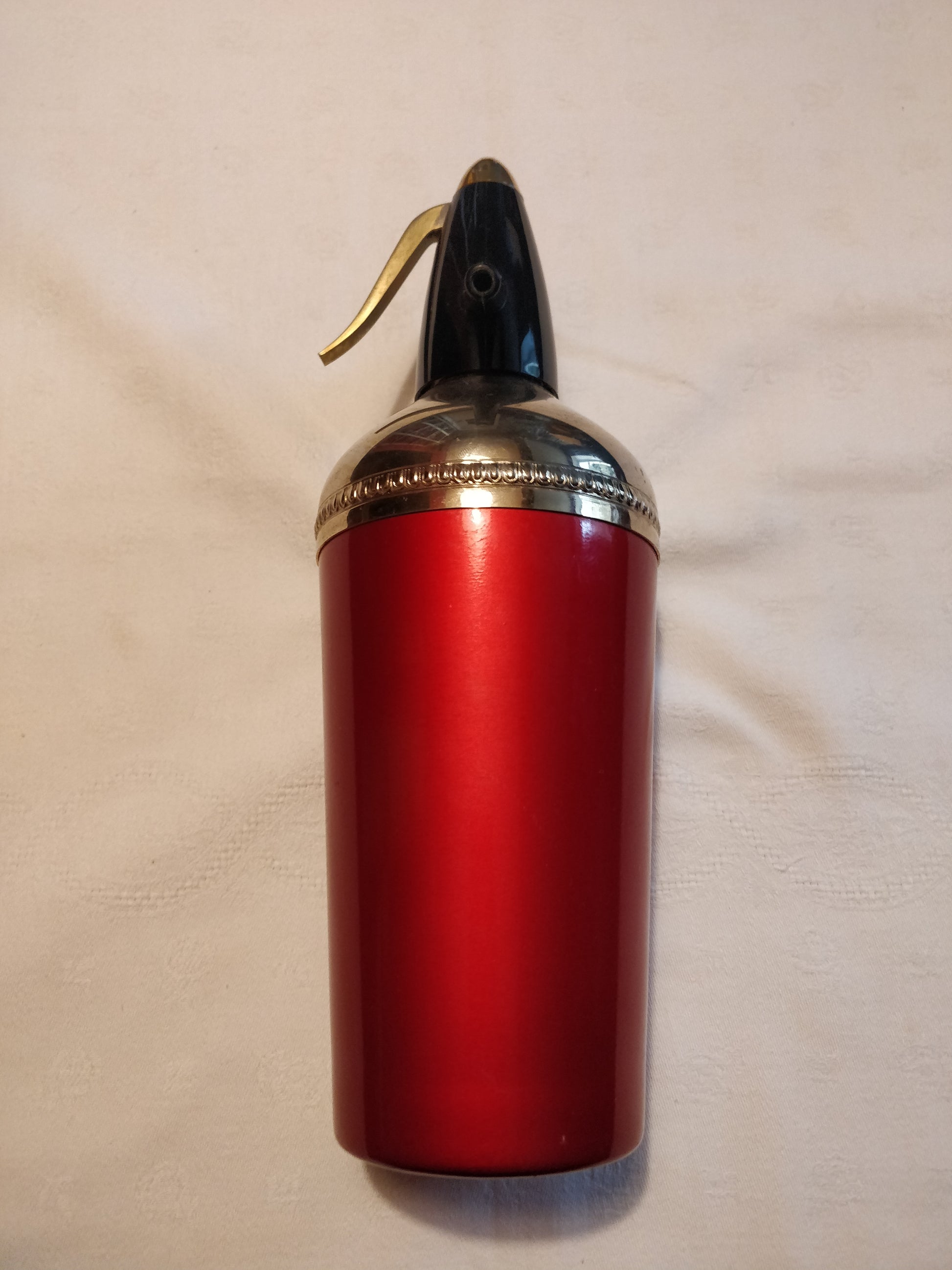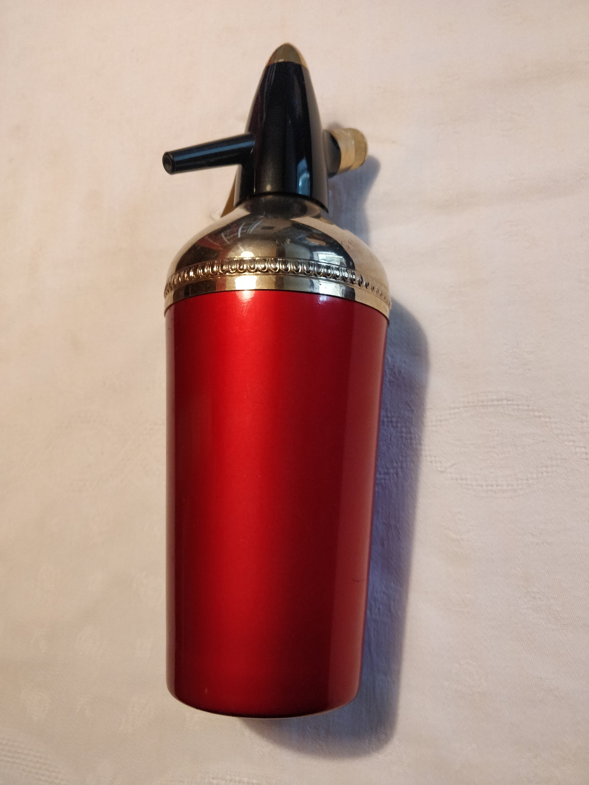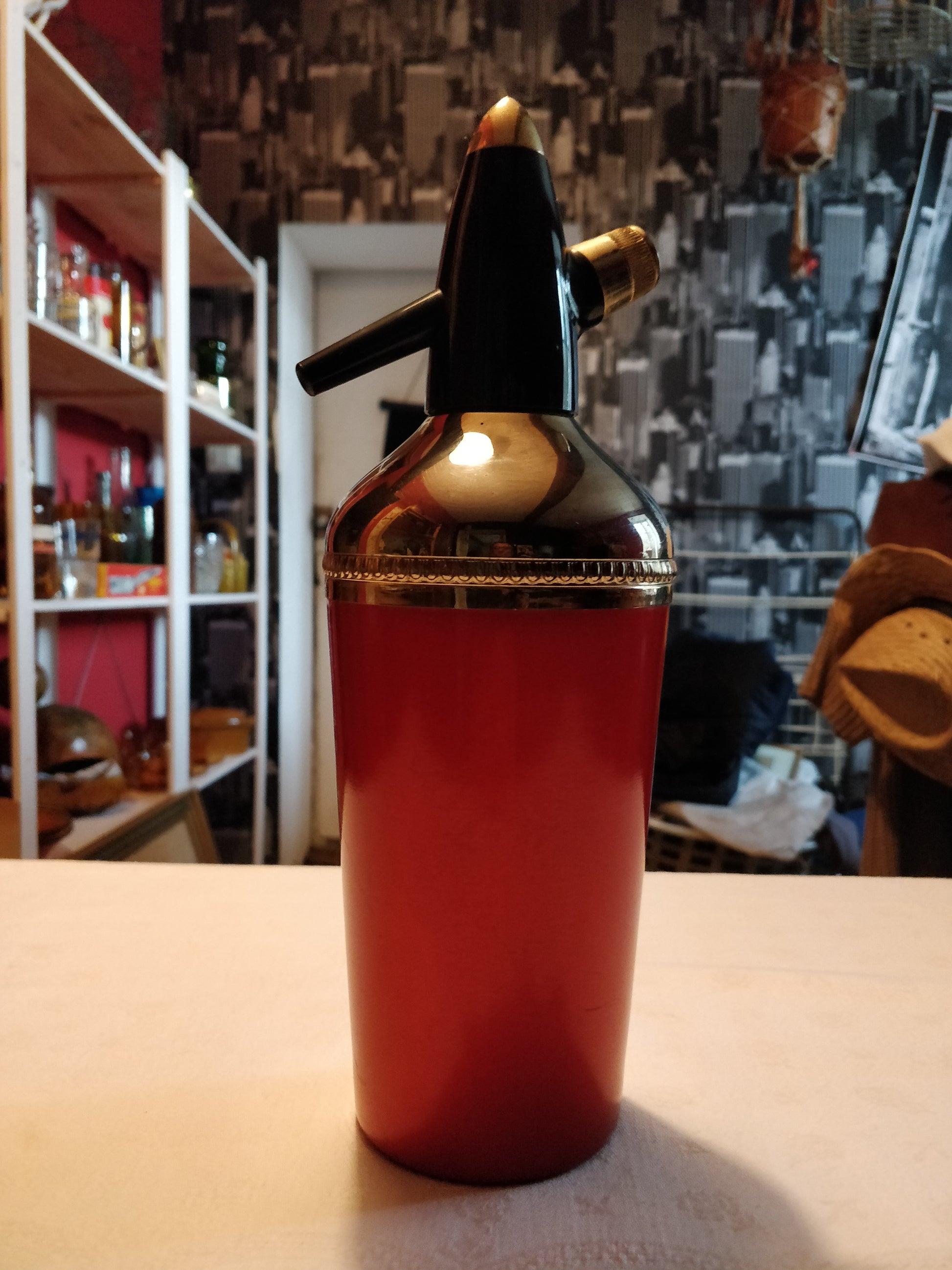 Siphon rouge, doré, noir en acier de très bonne qualité.