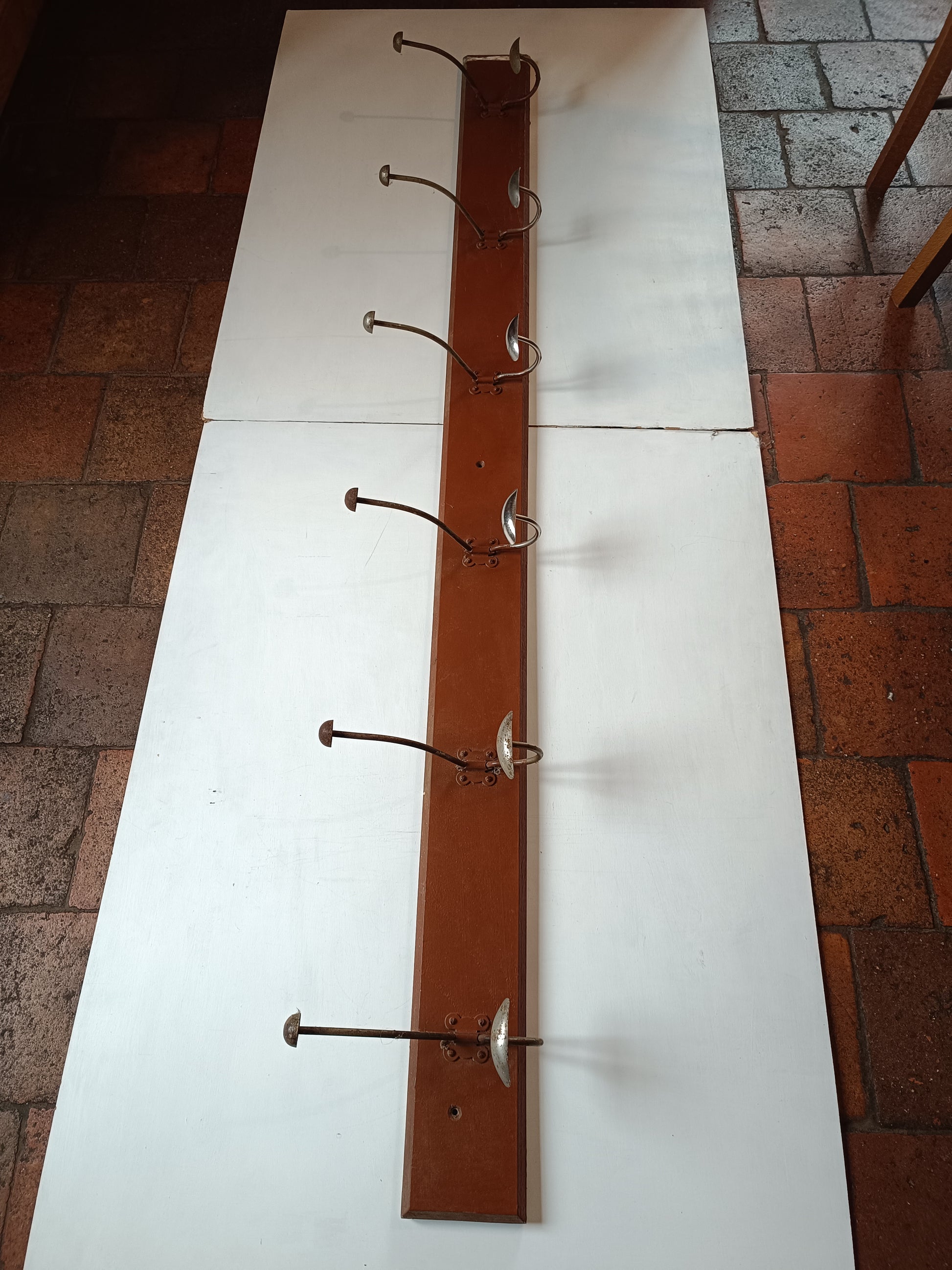 Ancienne patère d'école en acier et support en bois, année 30.