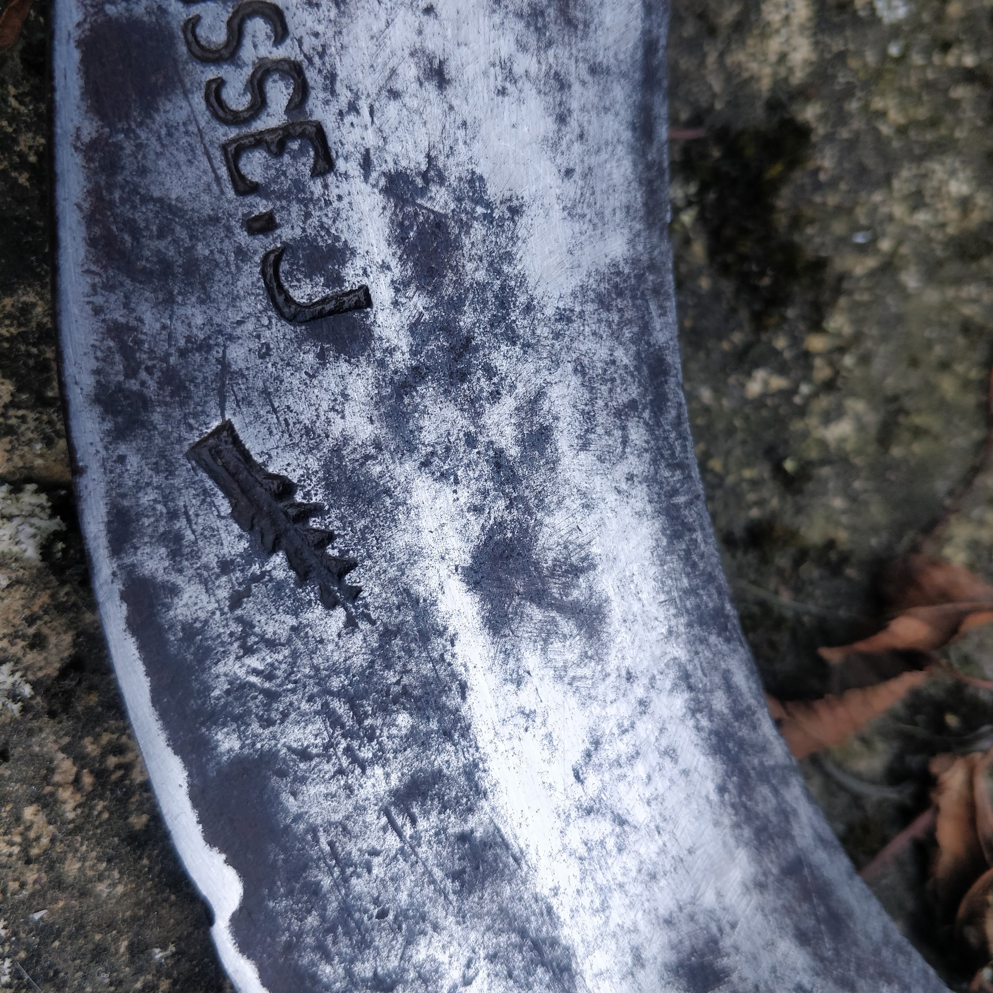 Celle-ci est en fer forgé, d'un côté il y a inscrit le nom du forgeron et le nom du bûcheron qui travaillait avec cet outil. (voir les photos).