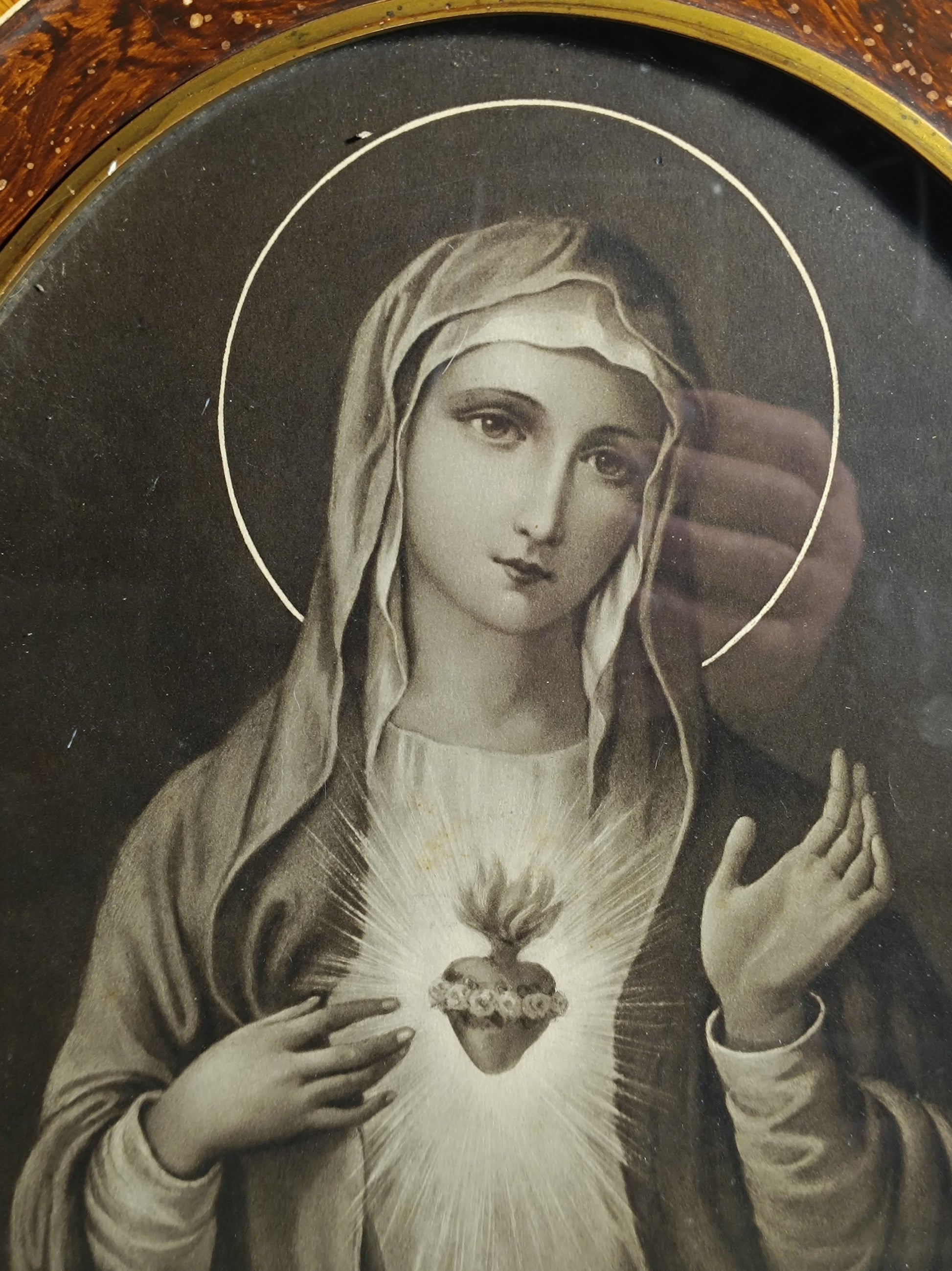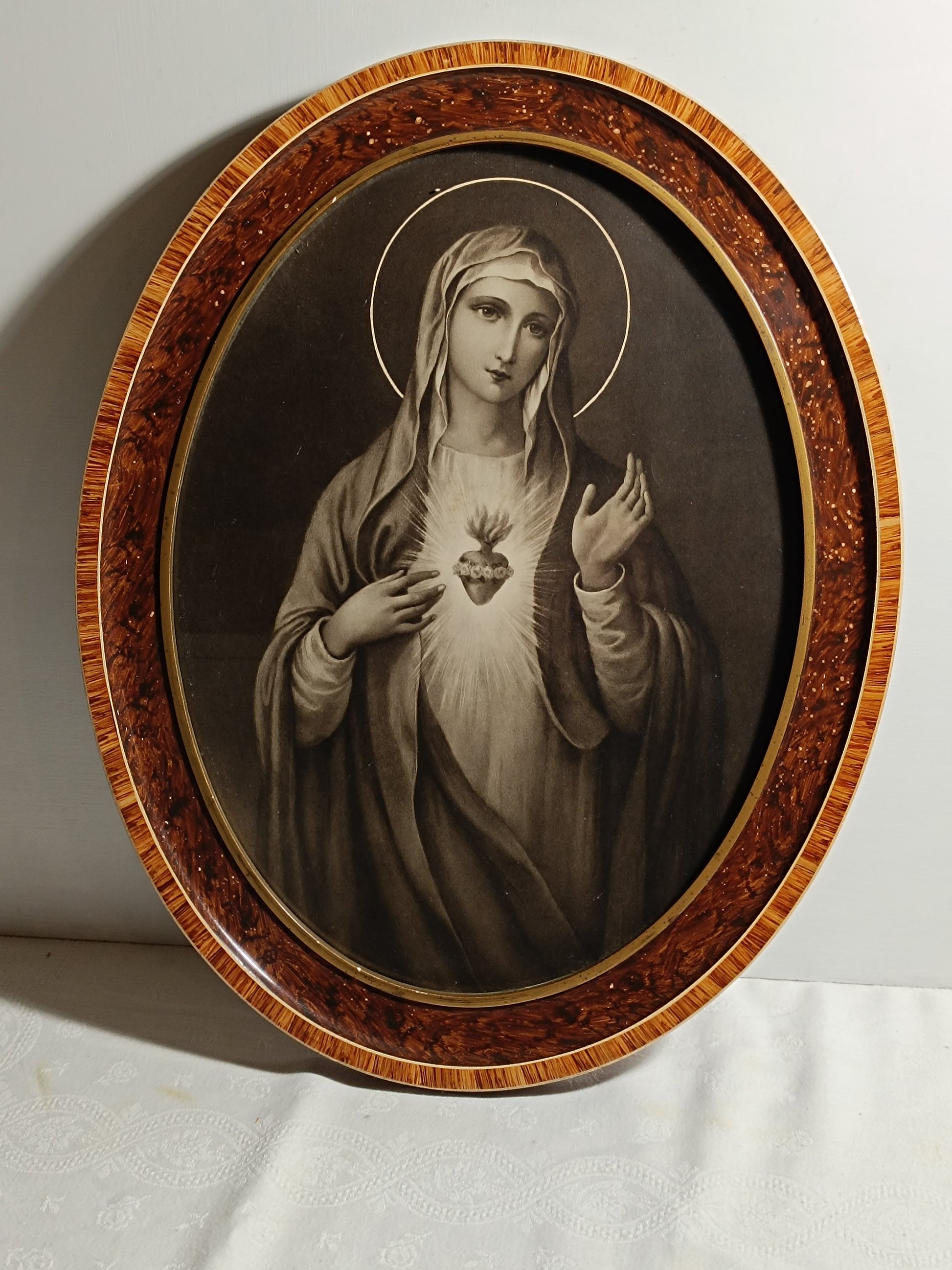 Cadre ancien, en bois et plâtre, avec une photo ancienne, Marie le Coeur-Sacré.
