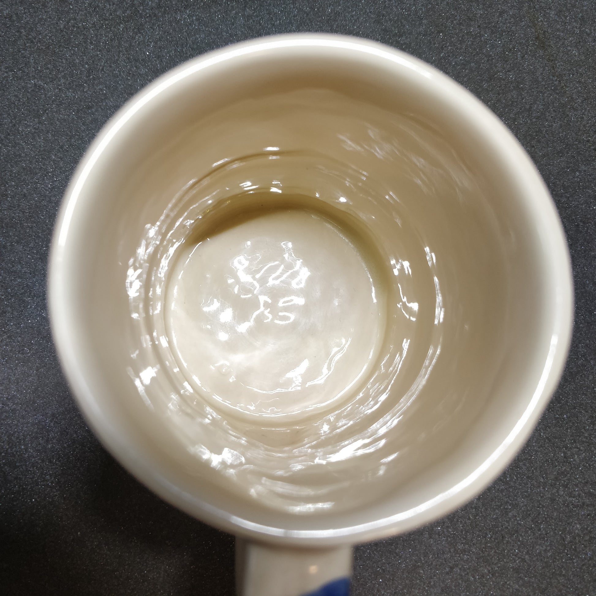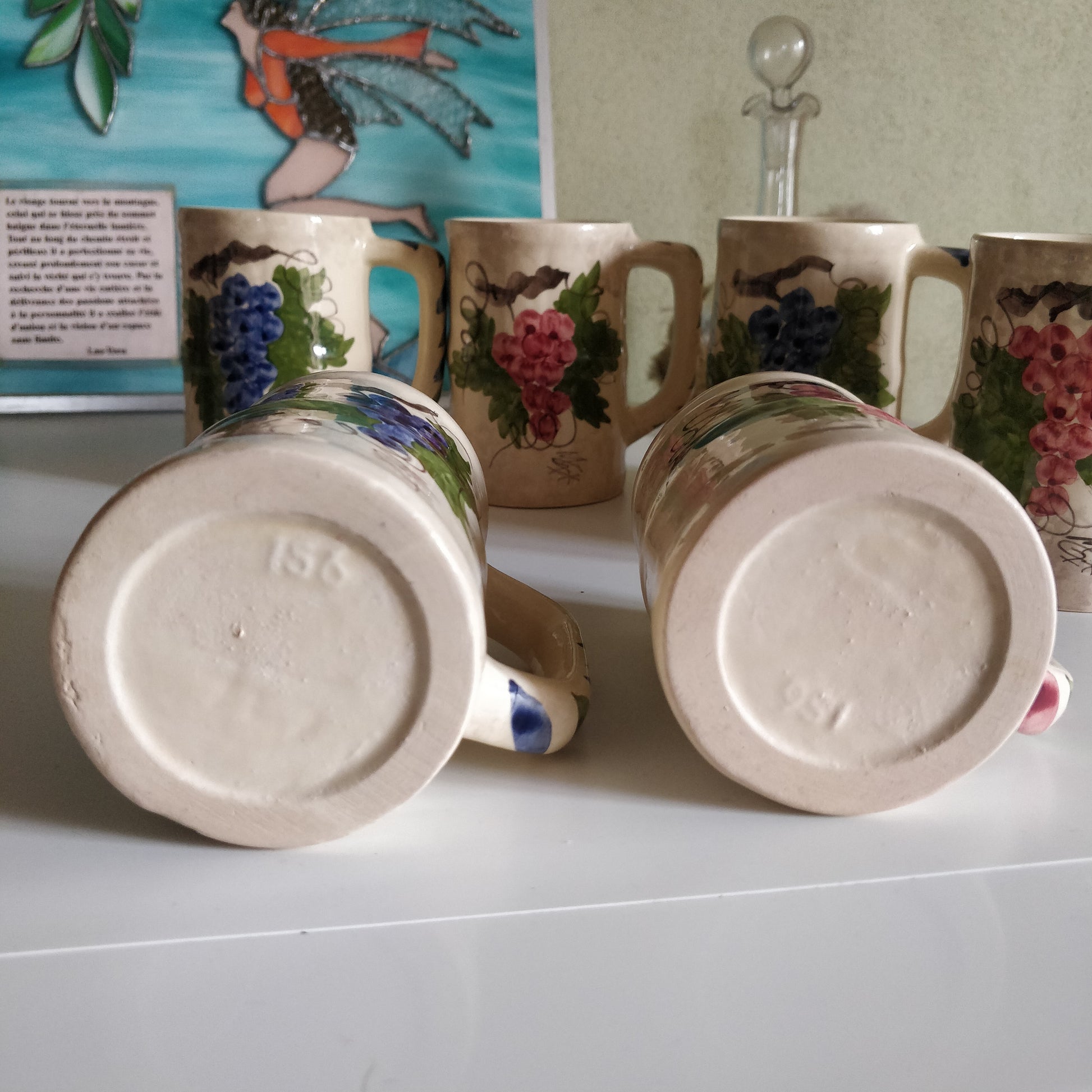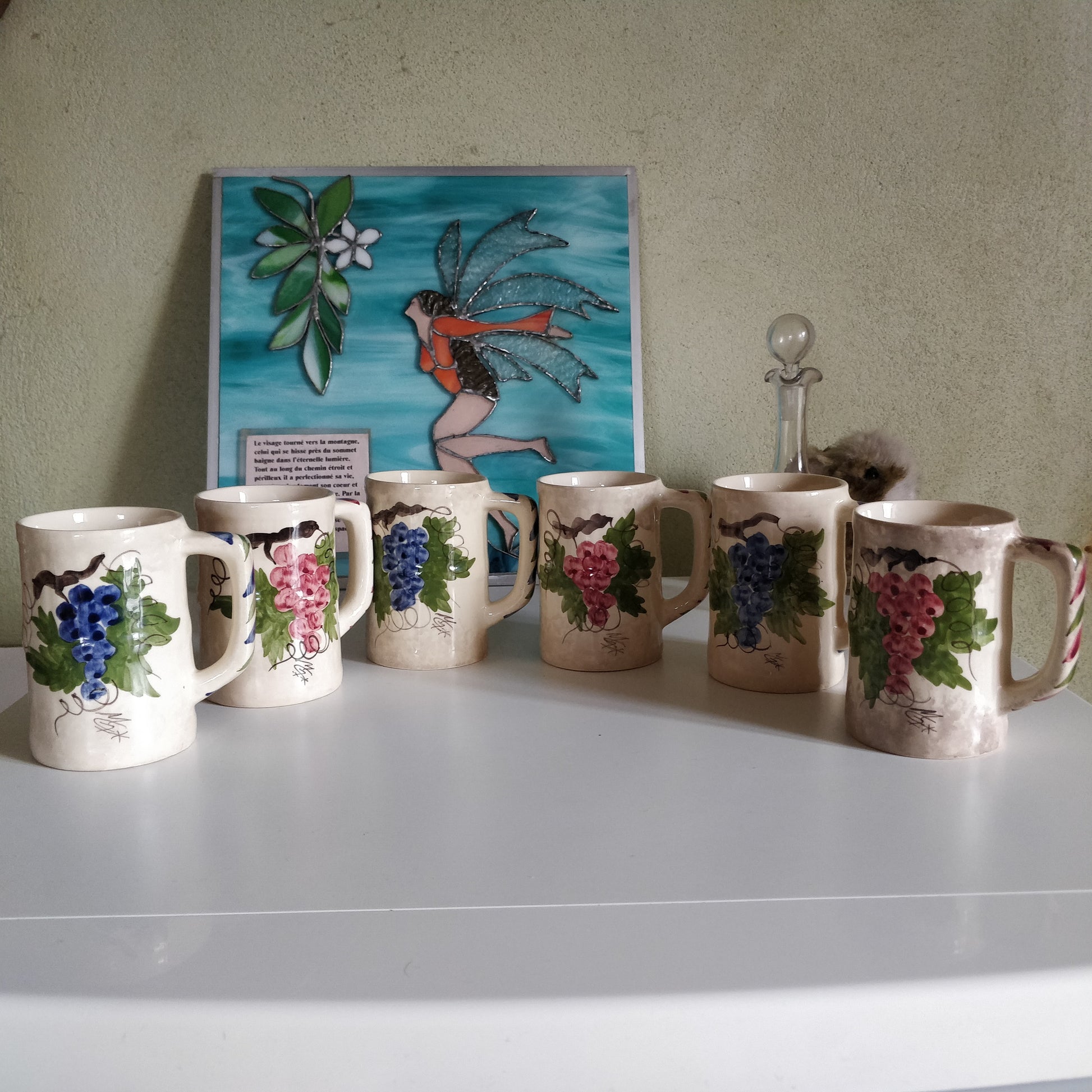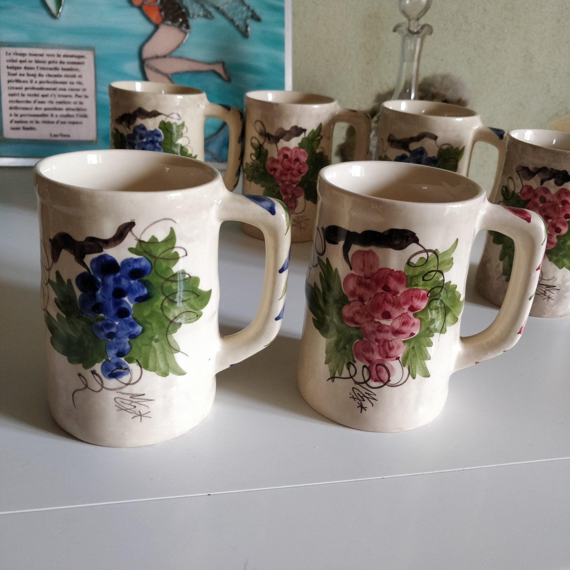 six chopes de couleurs crème avec une décoration sarment de vigne feuillages et grappes de raisin, trois chopes de tons bleu et trois dans les ton roses avec des nuances différentes.
