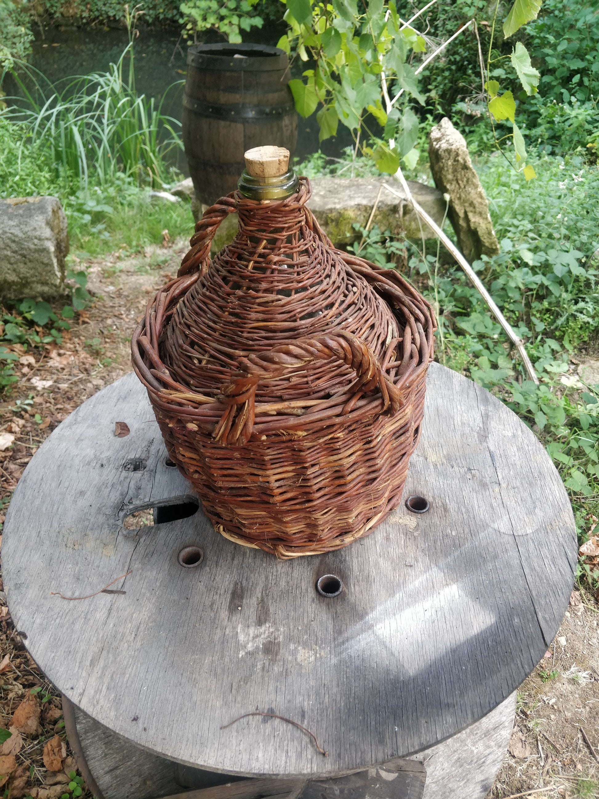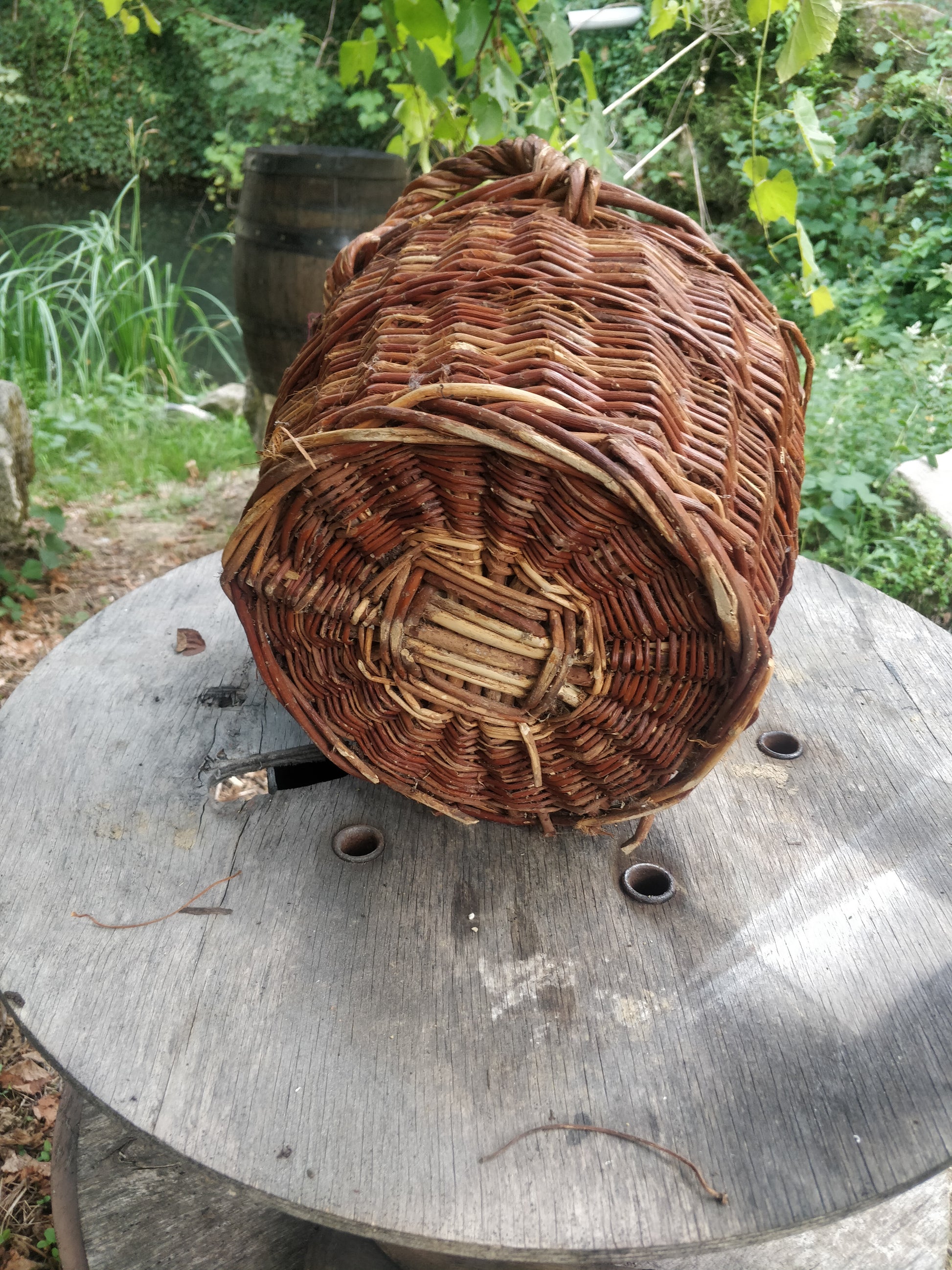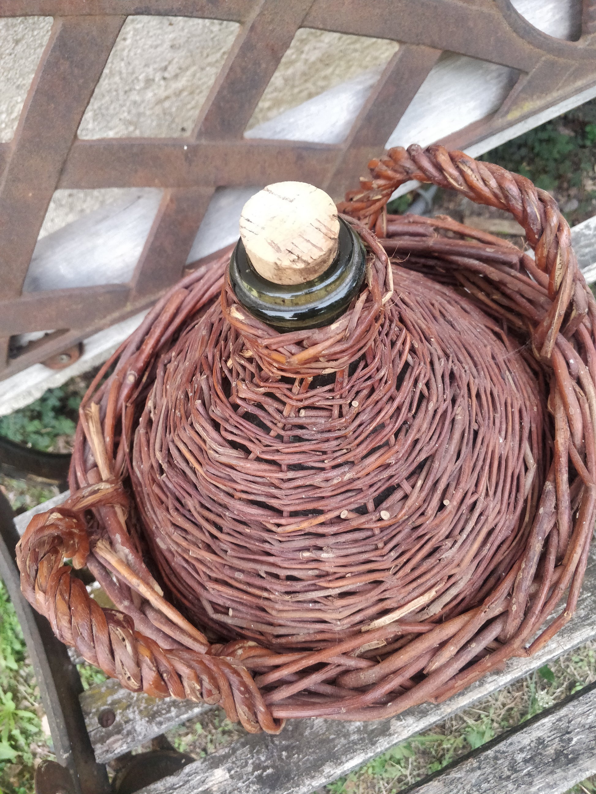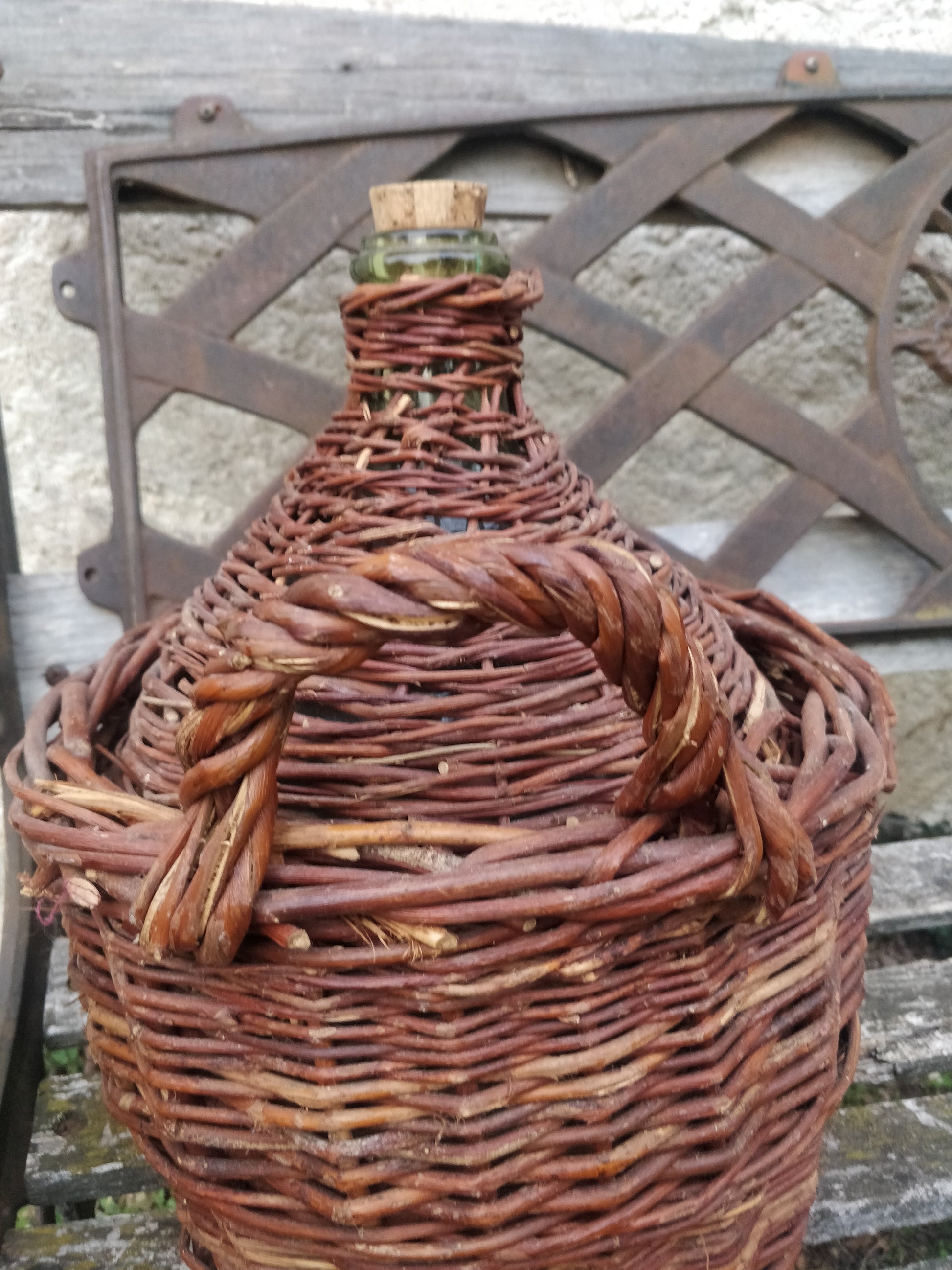 Cette Dame Jeanne à conservé son habillage en osier dans un belle état, autrefois cela servait de protection et permettait de la prendre plus facilement.