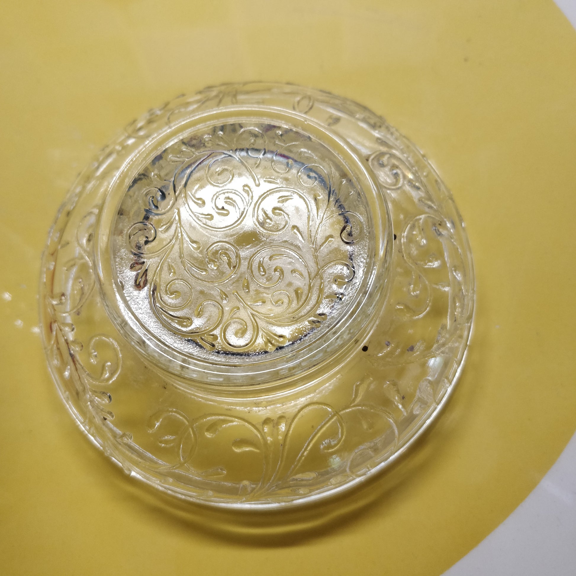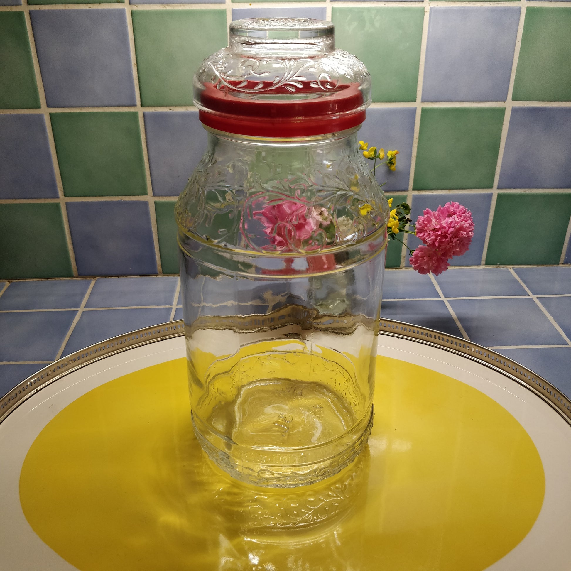 Grand bocal verre blanc moulé avec couvercle hermétique, jolis motifs en relief, contenance trois litres (gravé Italy).