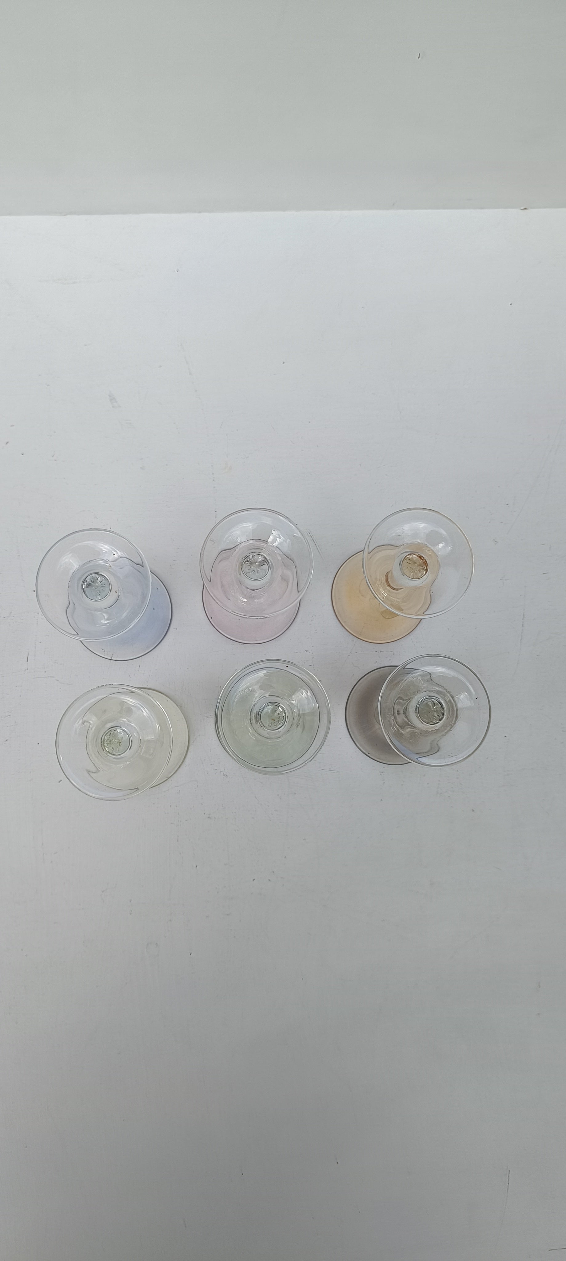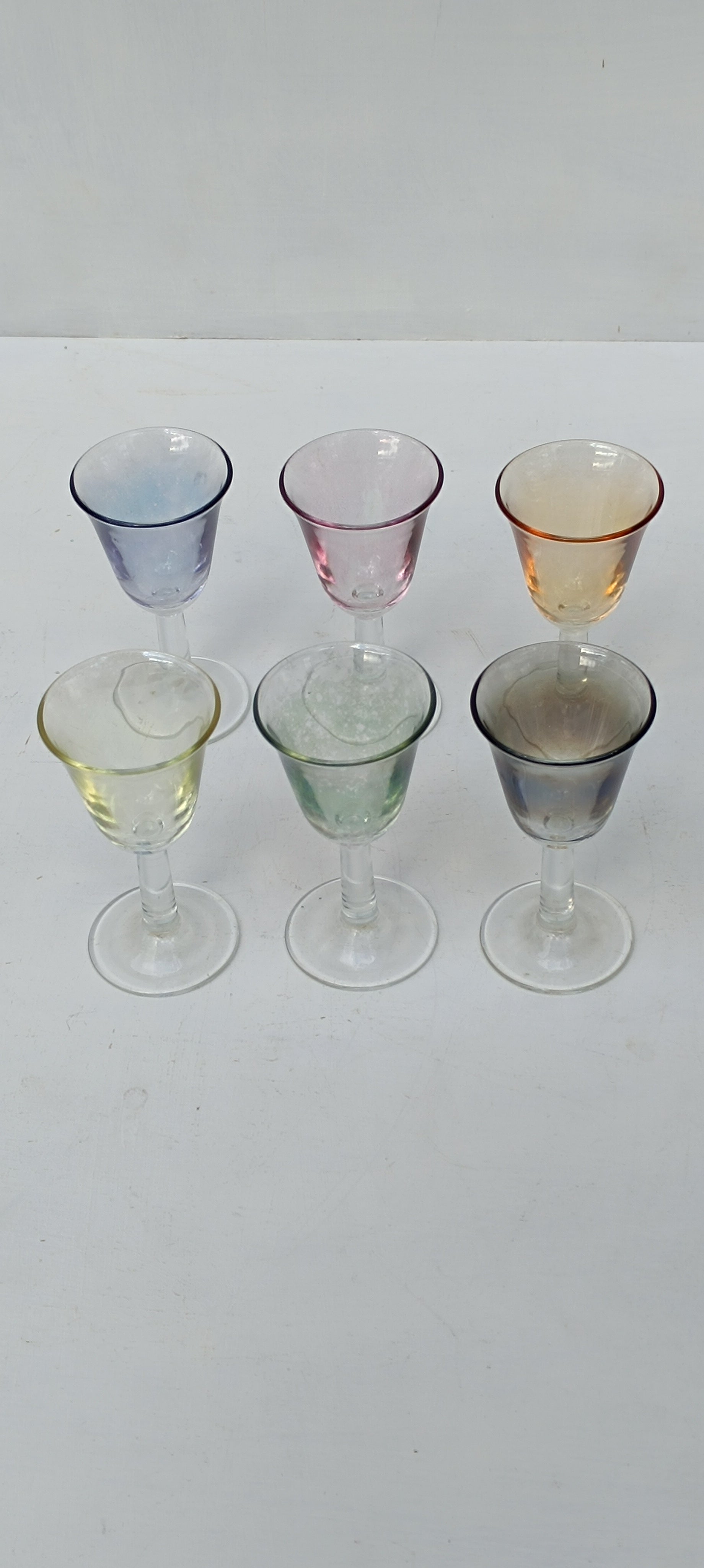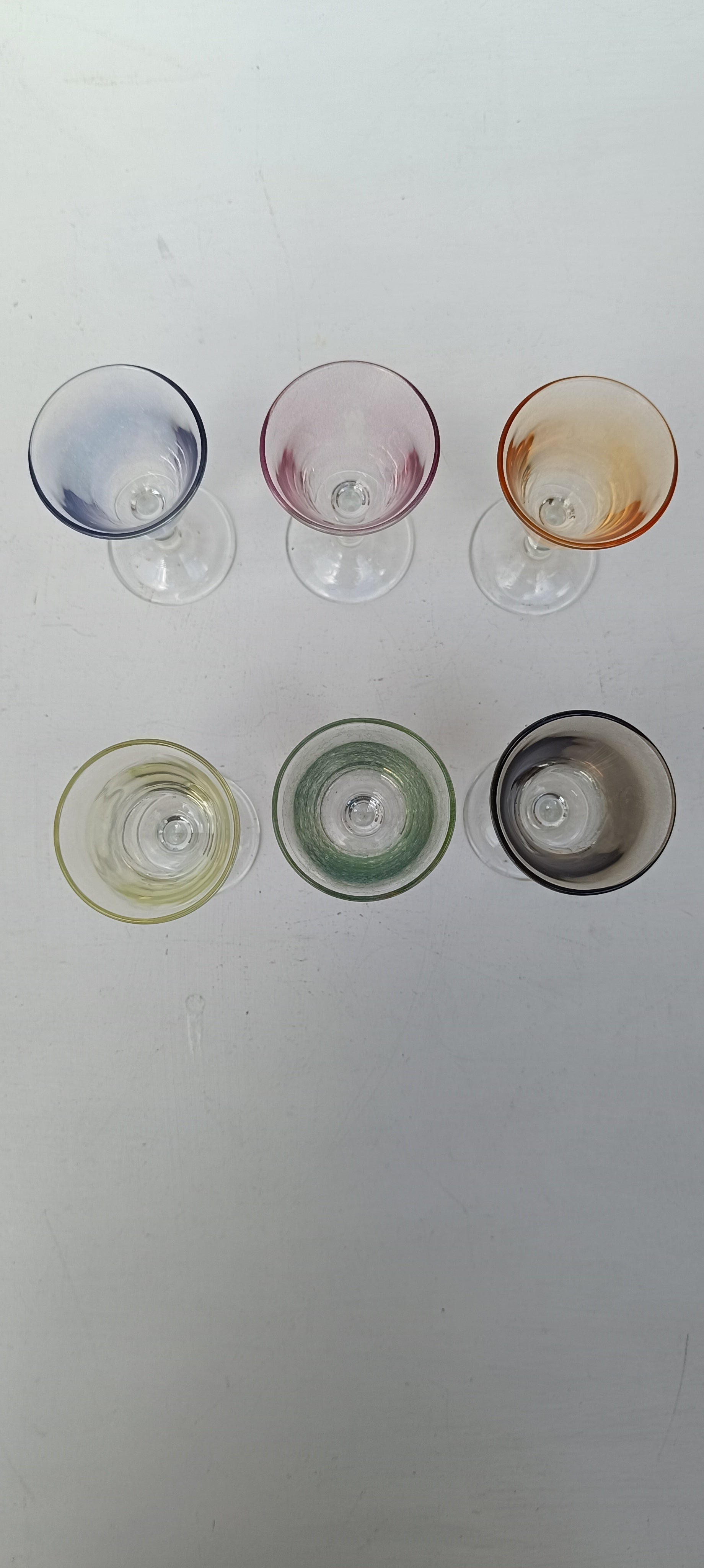 Lot de six verres à liqueur ou digestif de différentes couleurs.