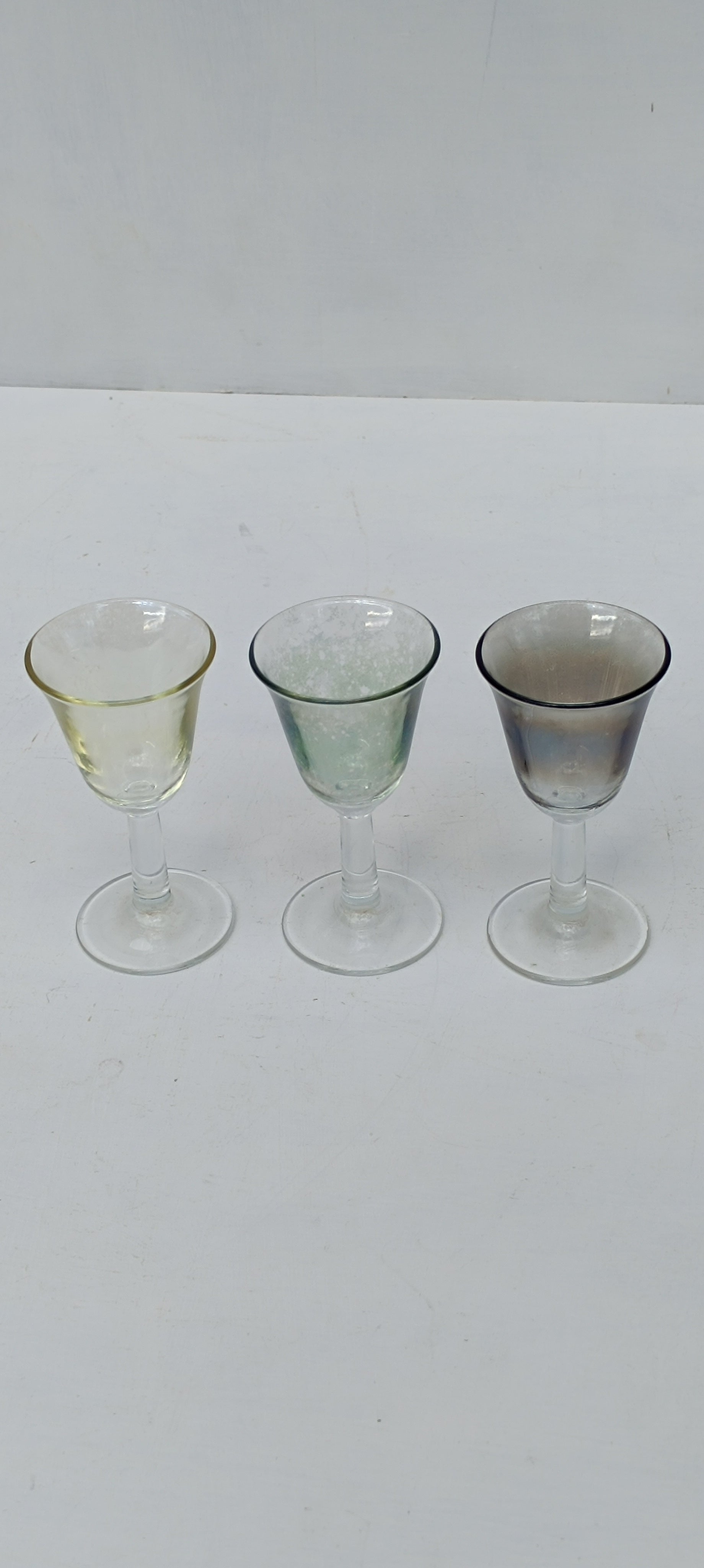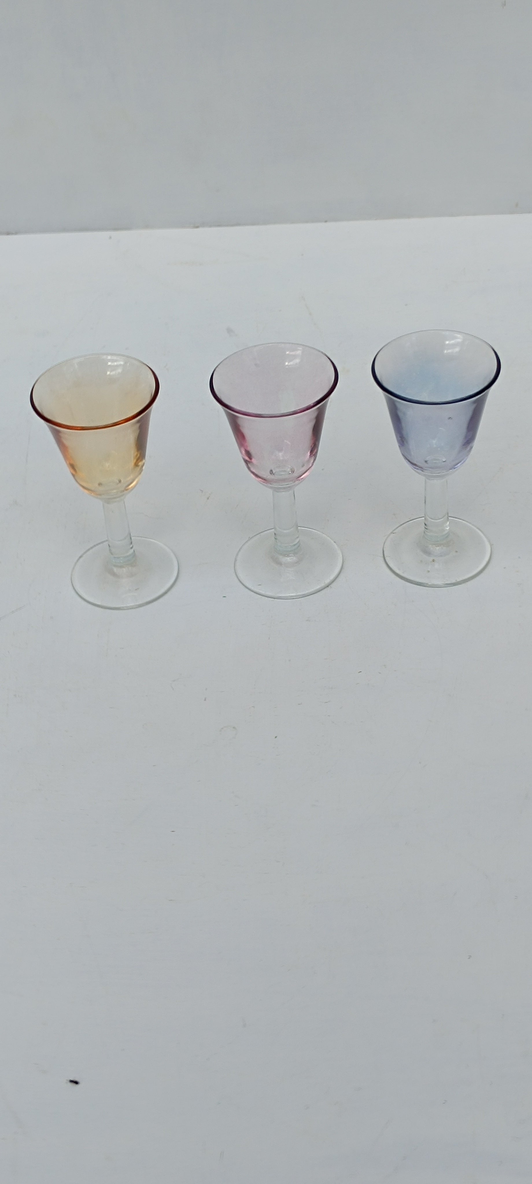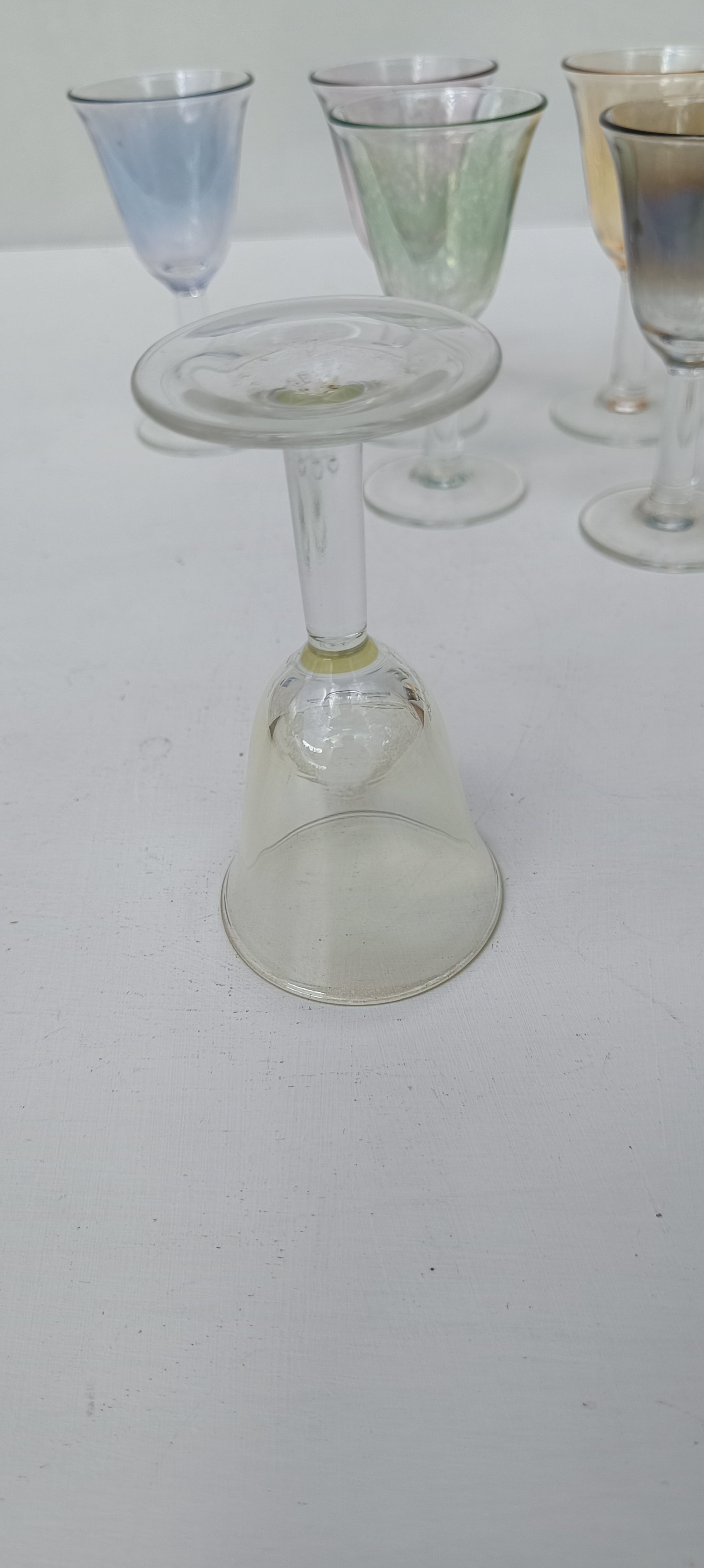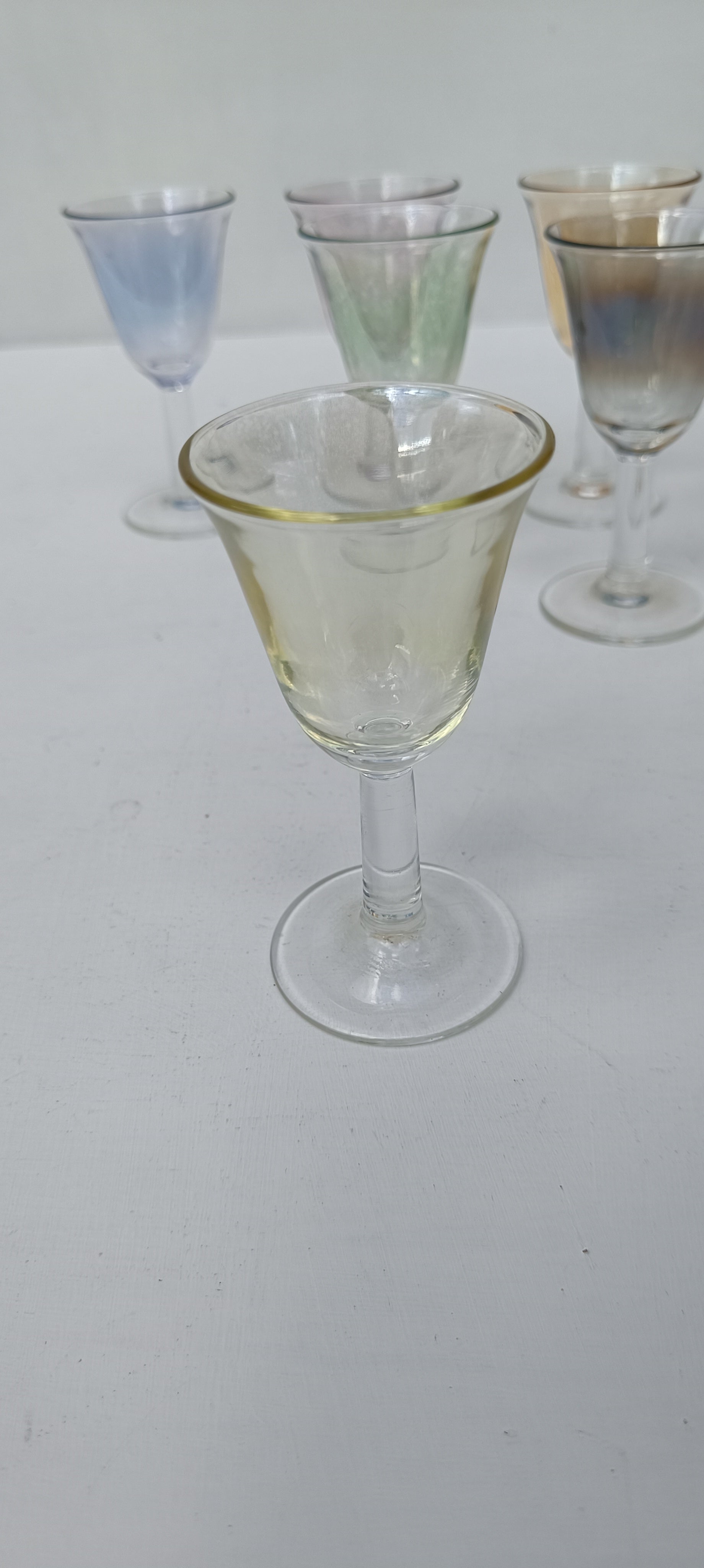Lot de six verres à liqueur ou digestif de différentes couleurs.
