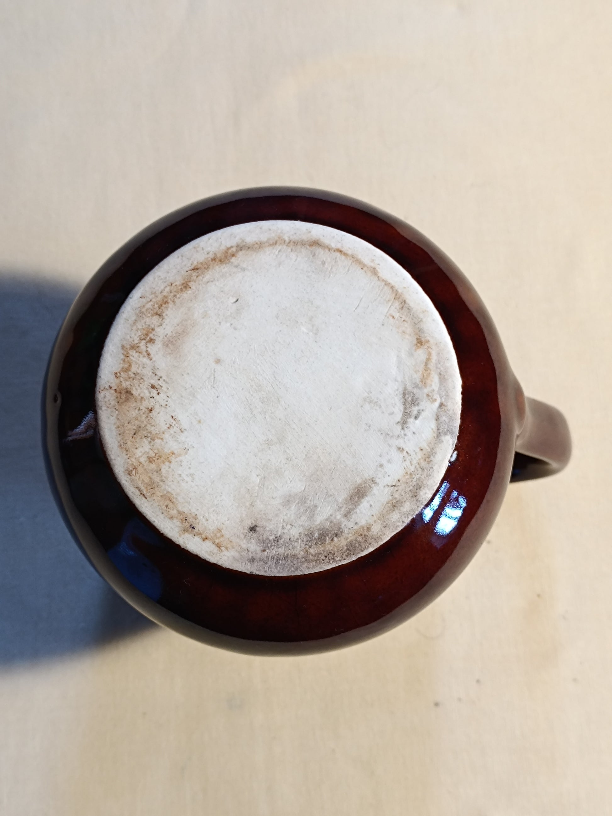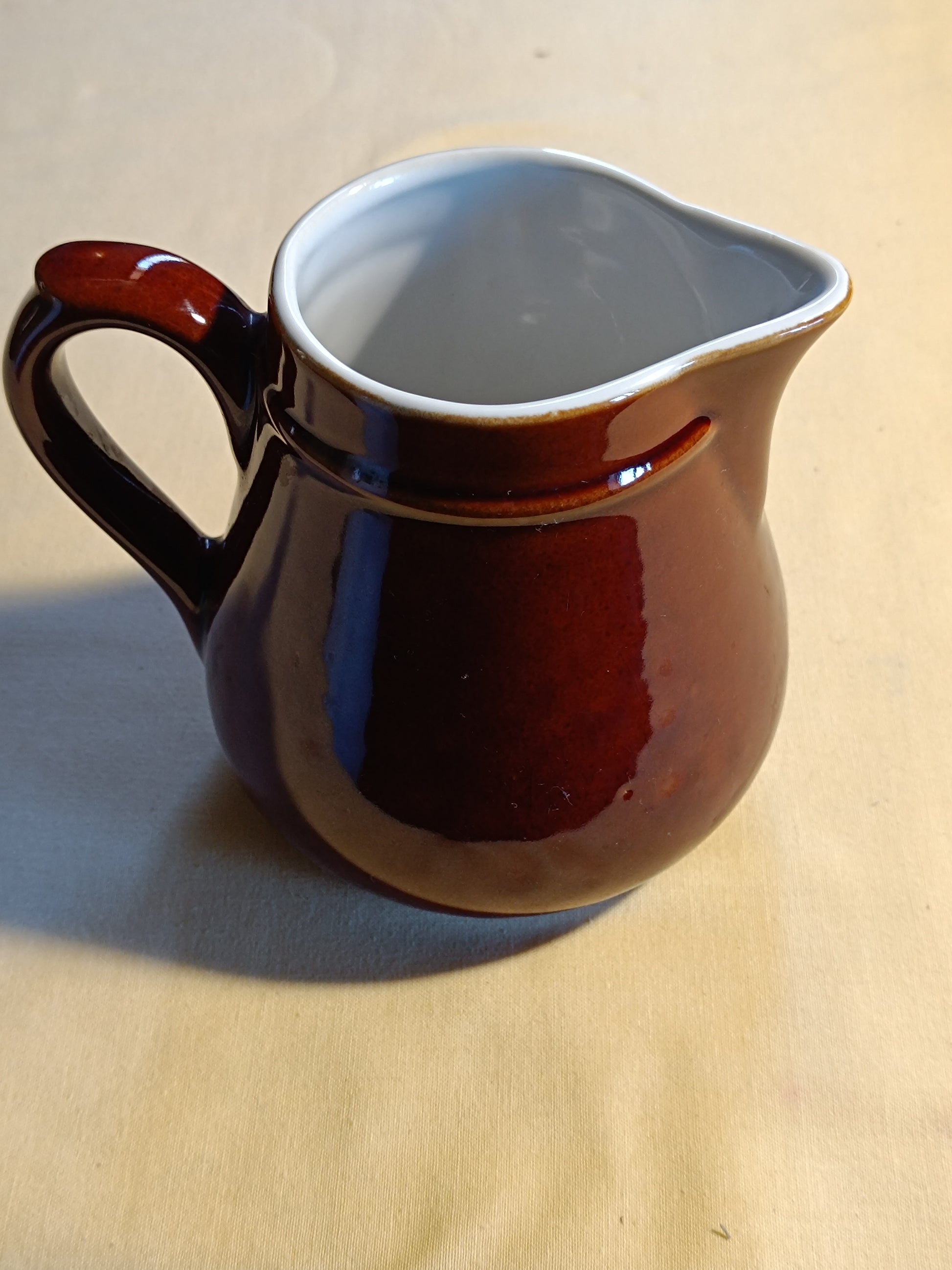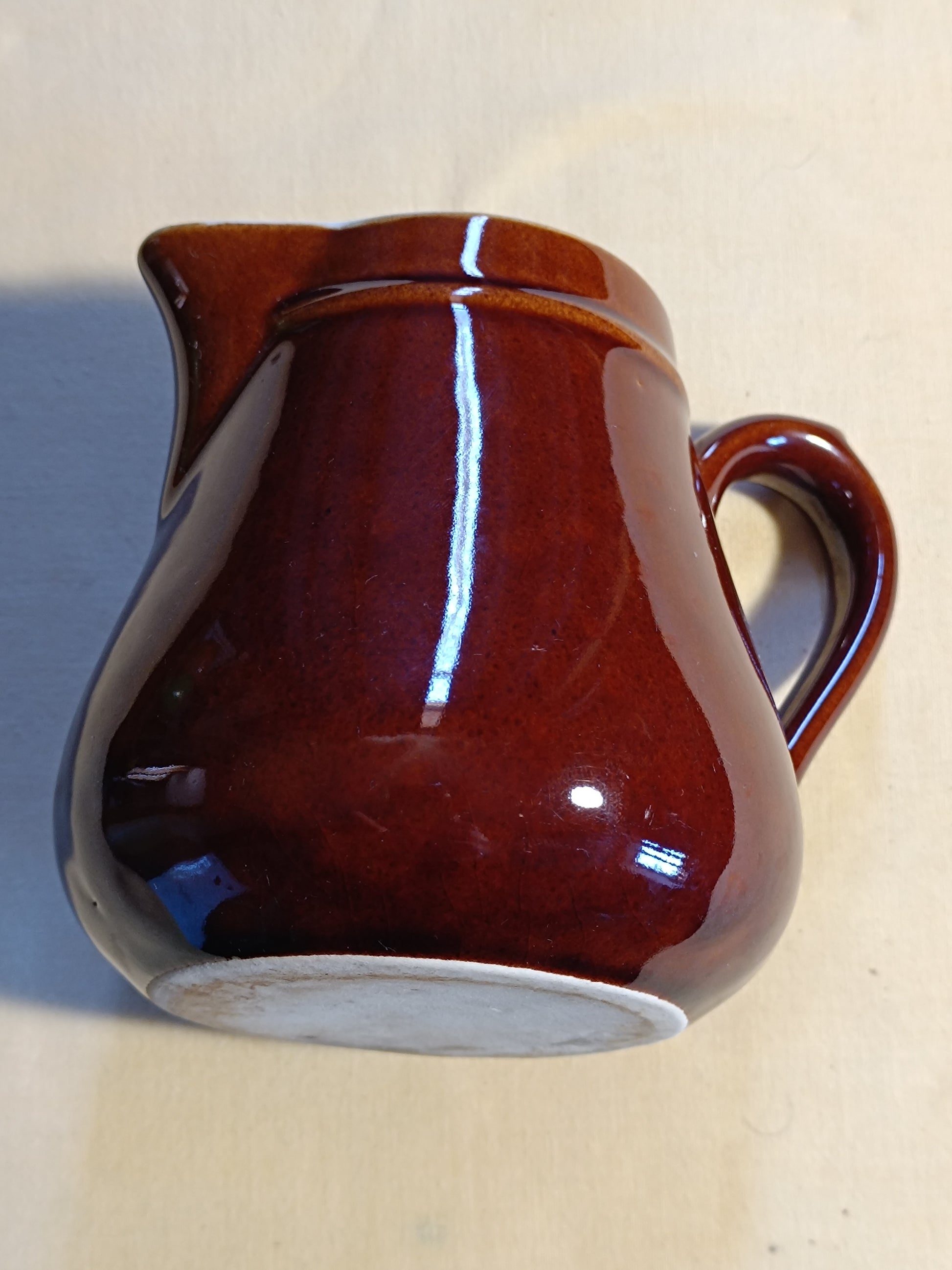 Ancien pichet ou pot à lait en terre cuite vernissée marron.